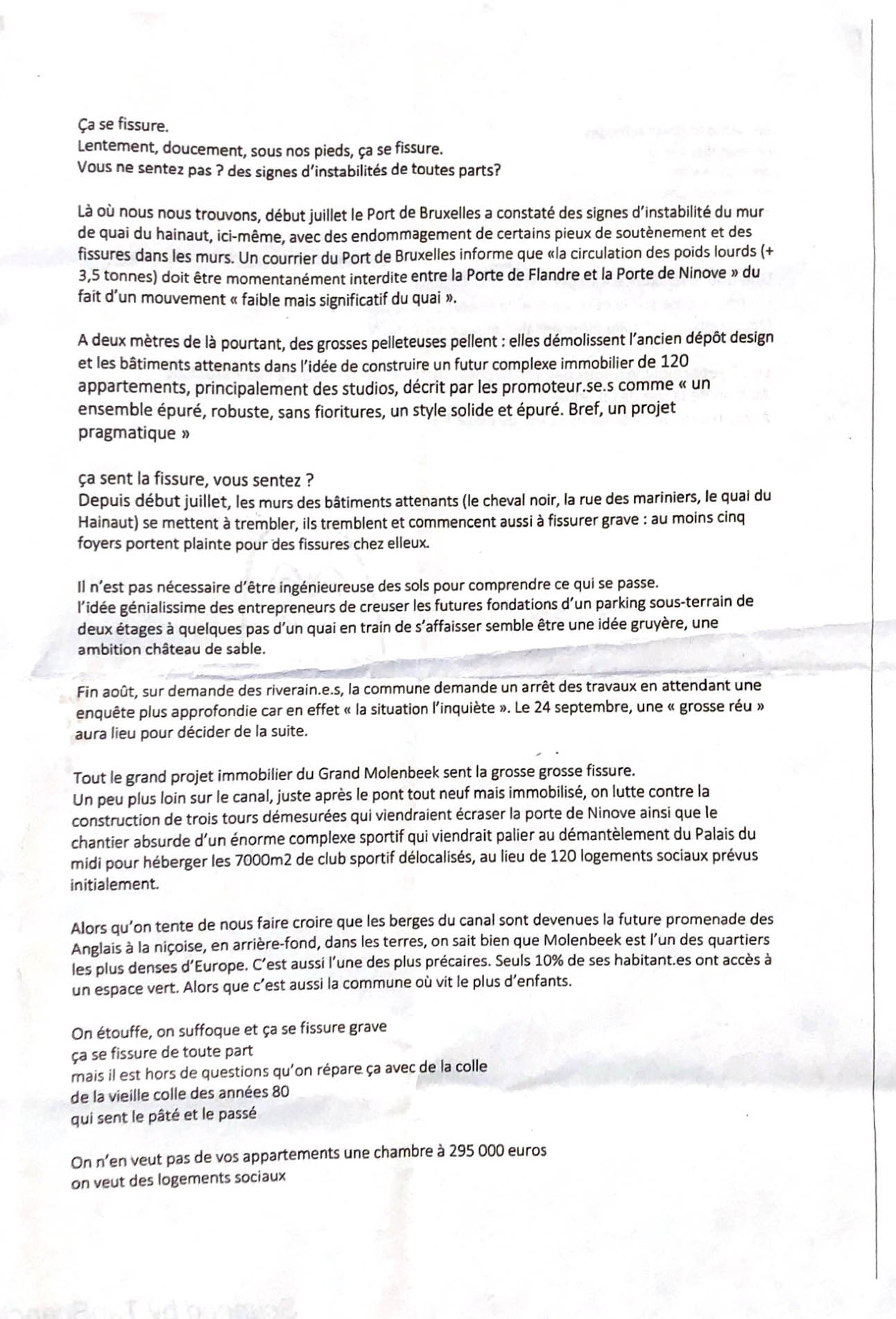 La ville tangue. Entre les murs et les pierres, quelque chose pousse. Des graines, semées par celles et ceux qui refusent de s’effacer. Dans le sol, le quai s’agite de plus en plus, les immeubles vacillent. Je me penche au-dessus du canal et j’aperçois un germe fendant enfin la surface de l’eau.