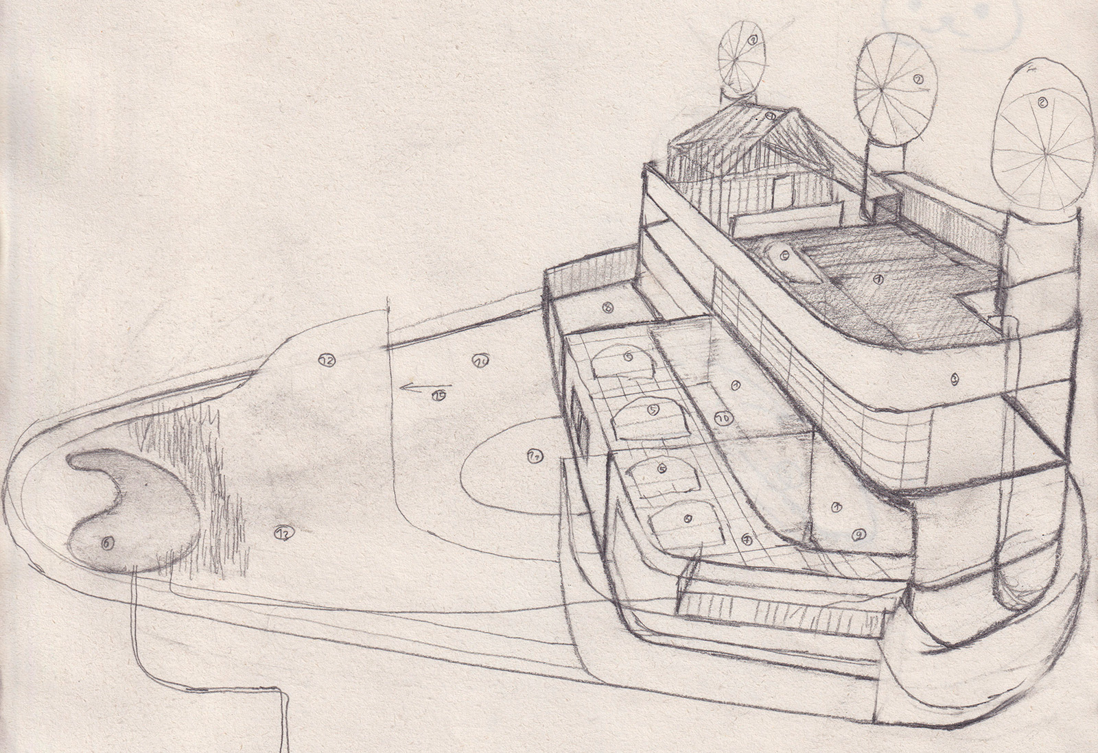 forme du terrain sert de support à l’un·e des participant·e·s, qui commence à dessiner