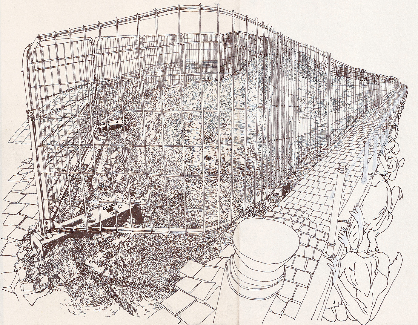 Un dessin de la friche, situé entre la rue du cheval noir et le quai du Hainaut. Fait sur le Quai du Hainaut de Hugo Lampaert.